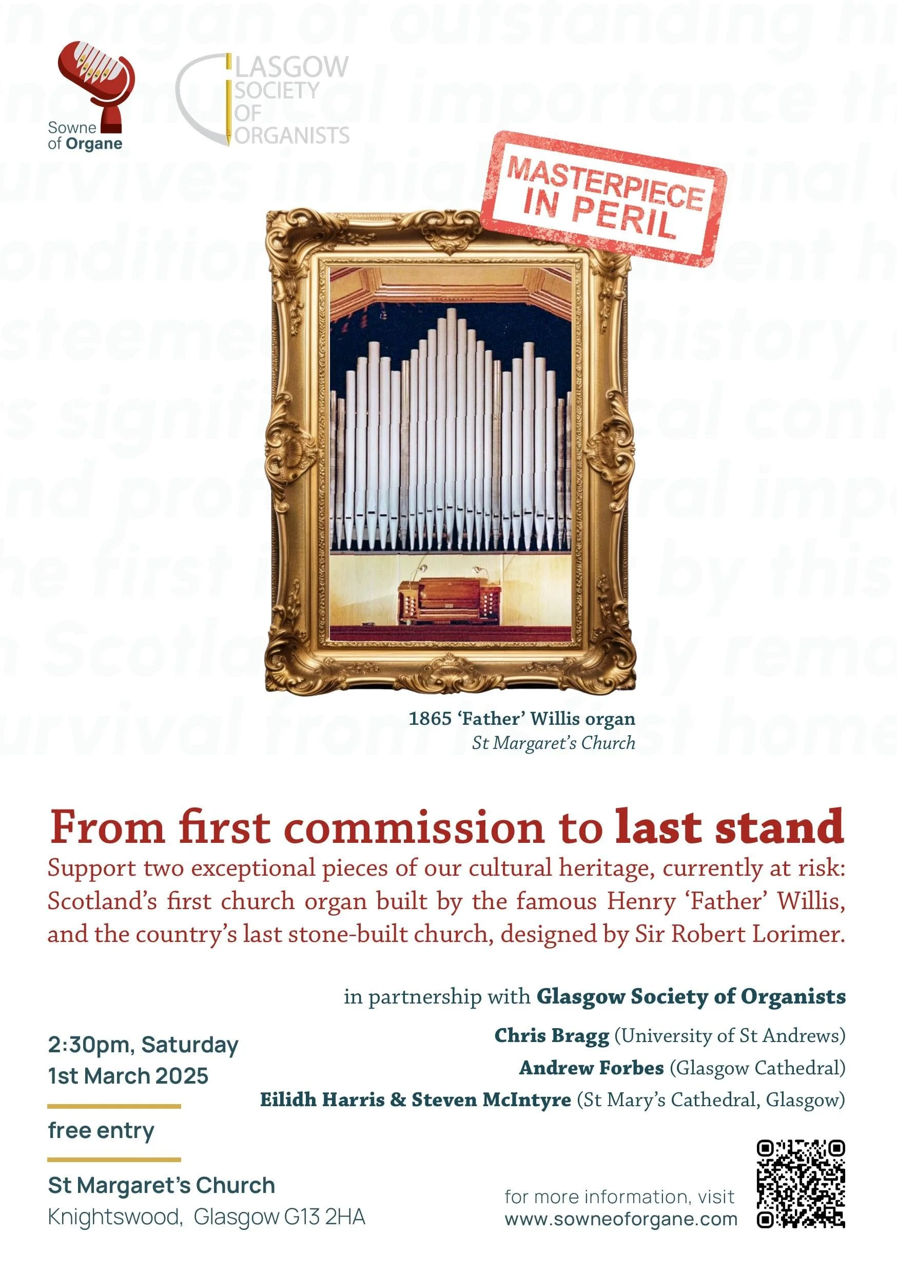 Join Sowne of Organe and Glasgow Society of Organists for this free afternoon event profiling the endangered 1865 Father Willis organ at St Margaret’s Church in Knightswood, Glasgow. With the church having been closed by the Church of Scotland, there are two masterpieces in peril: the historic pipe organ and the exceptional building itself.
