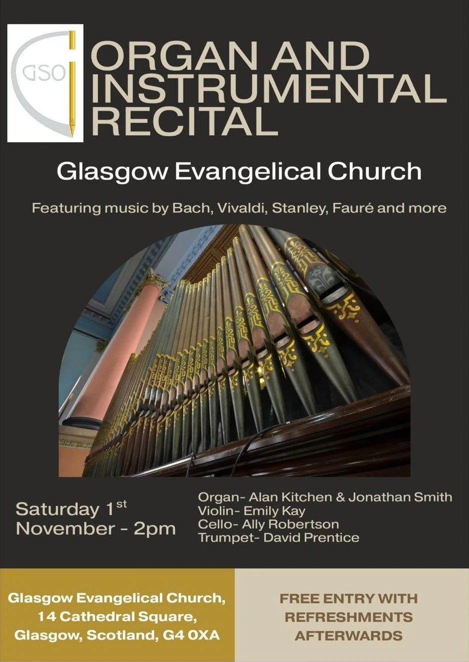 A recital featuring the organ of Glasgow Evangelical Church with other instruments (cello, trumpet, and violin).